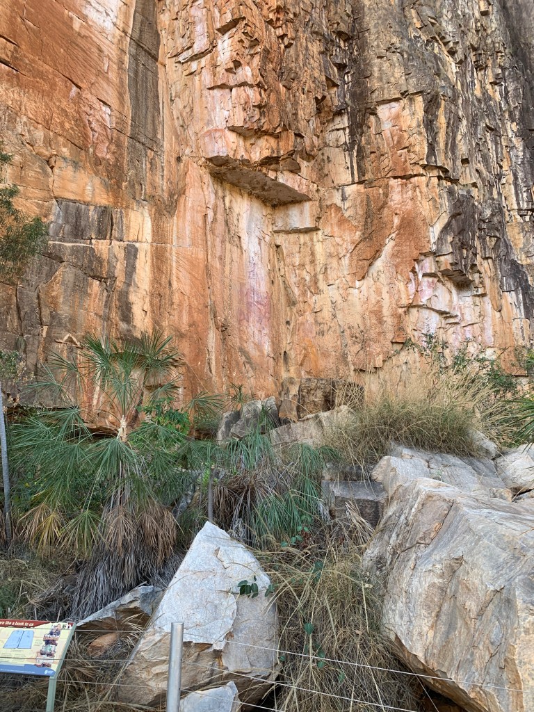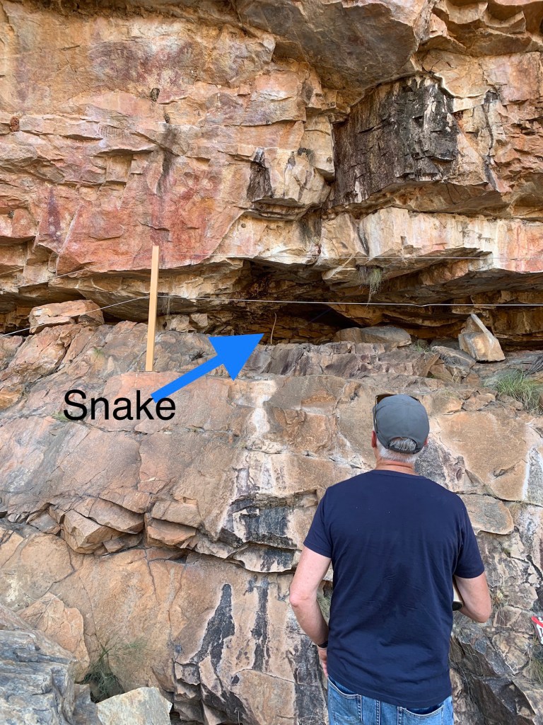The tour started off down river to the Gorge. The tour guide gives you a safety speech as we listen from the class room style seating. The other tour boat landed on the right and then he says I’m going to hand you over to Wayne who has jumped off the other boat and stood in front of us patrons. Hello I’m Wayne I’m going to be your tour guide today. Wayne was very resourceful and I believe was a very good guide. We rode up the river to another landing. Where we get off and walk to the upper part of the Gorge. On our way he mentions the aboriginal wall paintings on the Gorge cliffs. We veered off course a little and noticed a snake crawling within the wall cavities and yes some paints on display . See photo