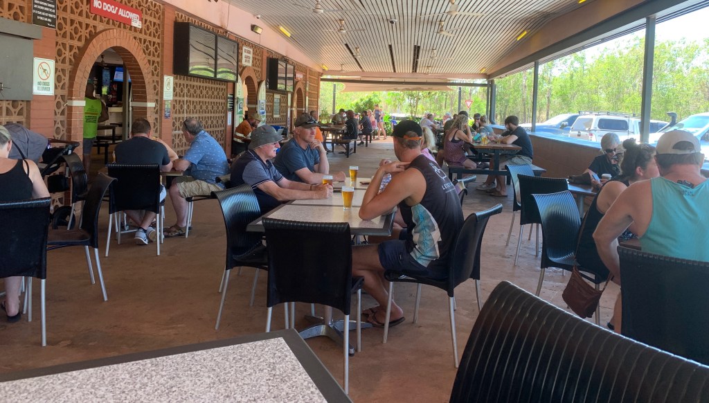 Ok, after our spectacular tour, we headed to the Humpty Doo hotel for lunch. On the menu were three sliders; Serving Buffalo, crocodile and fish. The croc looked and tasted like chicken. I wonder? This area is true Bogan territory and I’ll let you imagine the patrons in this pub. When you travel, you eat out a lot, like every meal, so afterwards, we went to the Darwin Ski club for a few beers and dinner. Yes, a ski club in Darwin. The members have such balls to water-ski in infested crocodiles and box jellyfish waters. The Thrill! Next up Singapore on a bus.