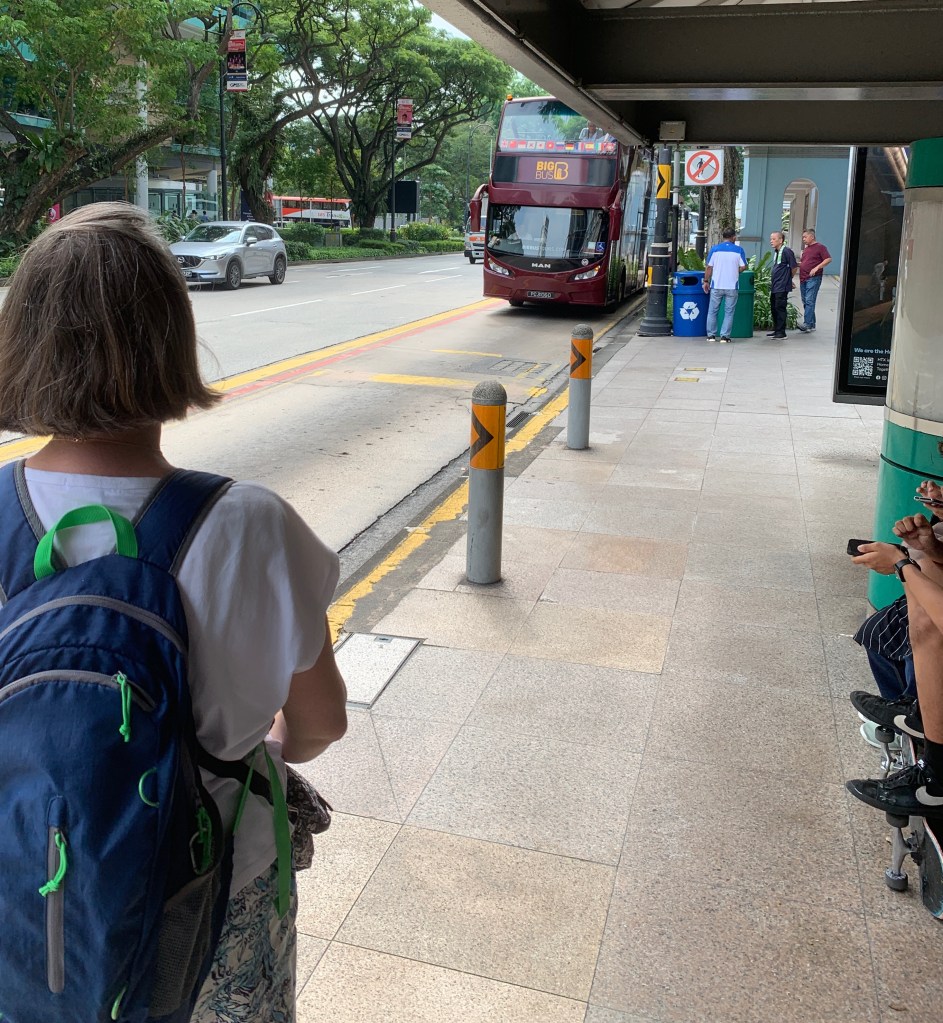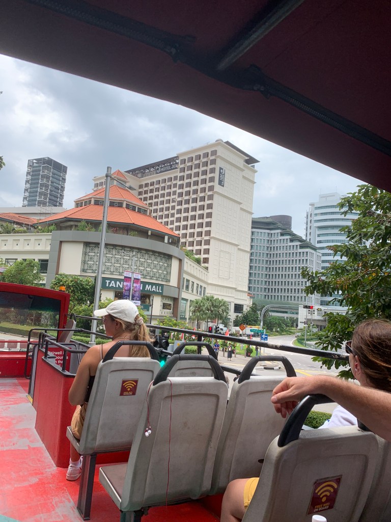 We organised to see Singapore via the hop on hop off tours (Big bus). One of the stops was at our hotel. We hopped on and went up to the top open deck. We managed to find a seat under the bus canopy seeking shade. I was excited, a mixture of old and new tall buildings clumped together shaping the skyline. There is a lot of money here and the qualities of companies showed it. As the bus raced down the traffic light infested roadways, I was slapped in the face by a cluster of hair from the lady in front. She had her hair out and it was so long that the wind blew it into my face. (Photo) She was oblivious to it, so I lean back to avoid the strands.