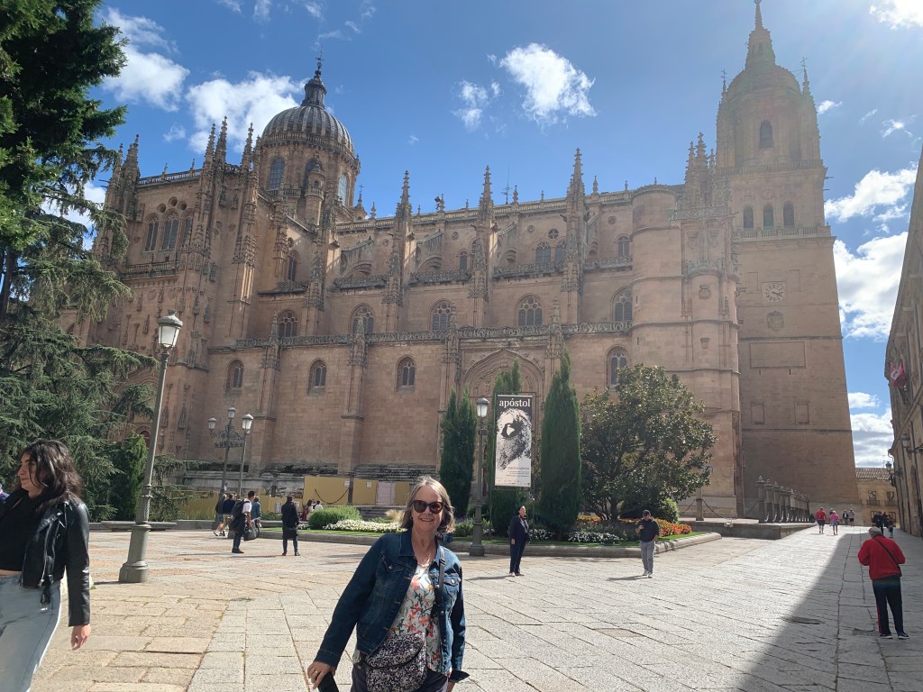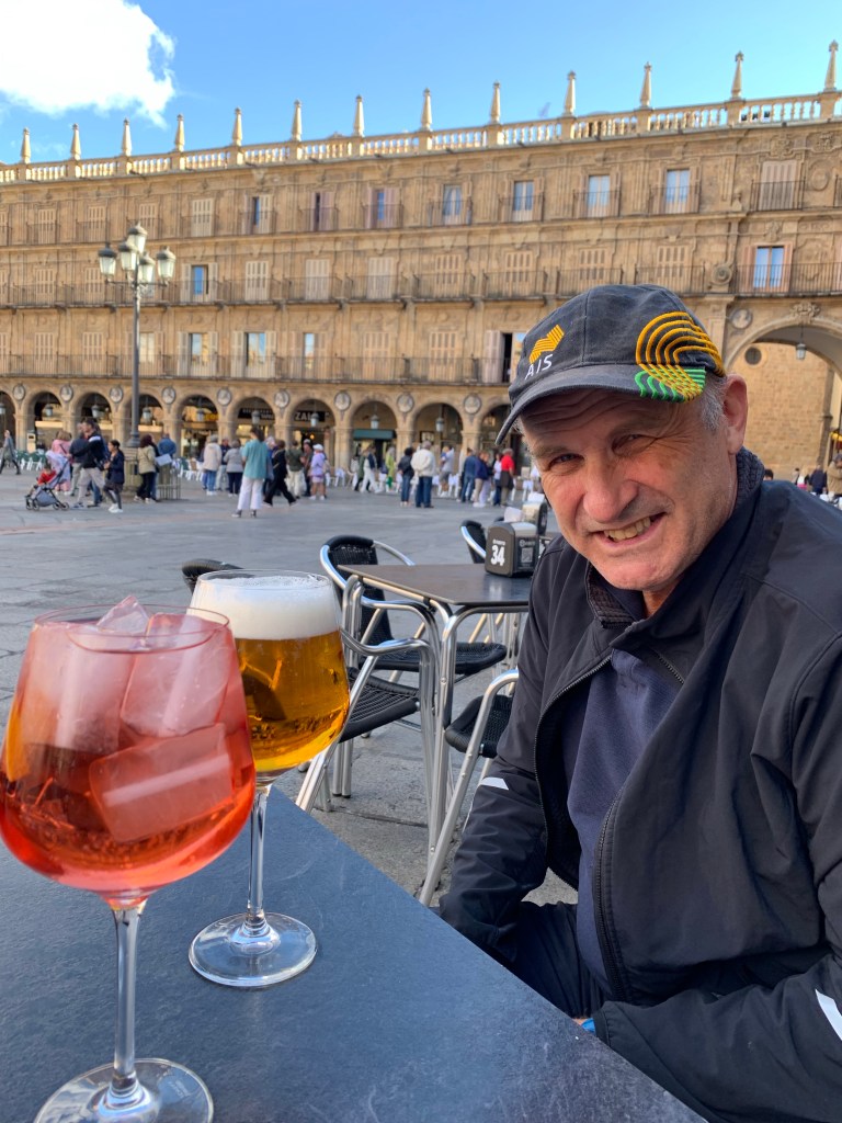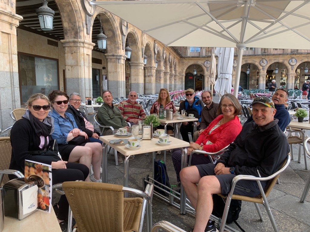 Our trip was to travel from Madrid to Salamanca, then on to Coimbra , Lisbon, The Algarve in Portugal, then to Seville and Tarifa in Spain then take the ferry to Chefchaouen, then onto Fes and Marrakech in Morocco. Anyway, We arrived in Salamanca by public train and then took a public bus to our hotel. It was quite a ways from the bus stop to the accommodation were the parade of luggage rolling along the streets could be heard through out the old walled city. The baggage wheels makes the thump-thump sound from the cobbled stone streets. Our hotel room had double glazed windows and we still could hear the sounds from the street so one would wonder whether the position of the surrounding buildings were designed to amplify the noise. The buildings which surround the Salamanca’s square (photo) are occupied by mainly residents. So if you lived in these apartments, you would have the continuous sounds of the square in your every day life. Something for the realtor to think about.