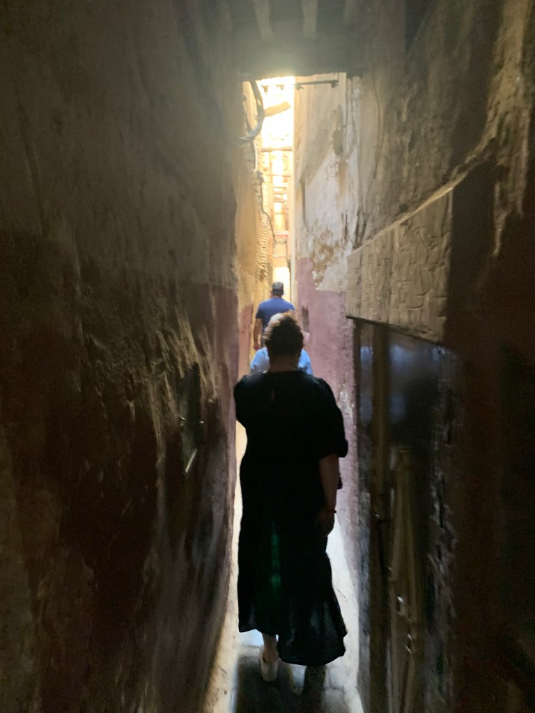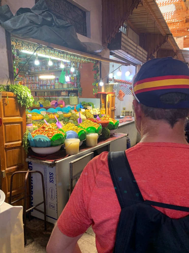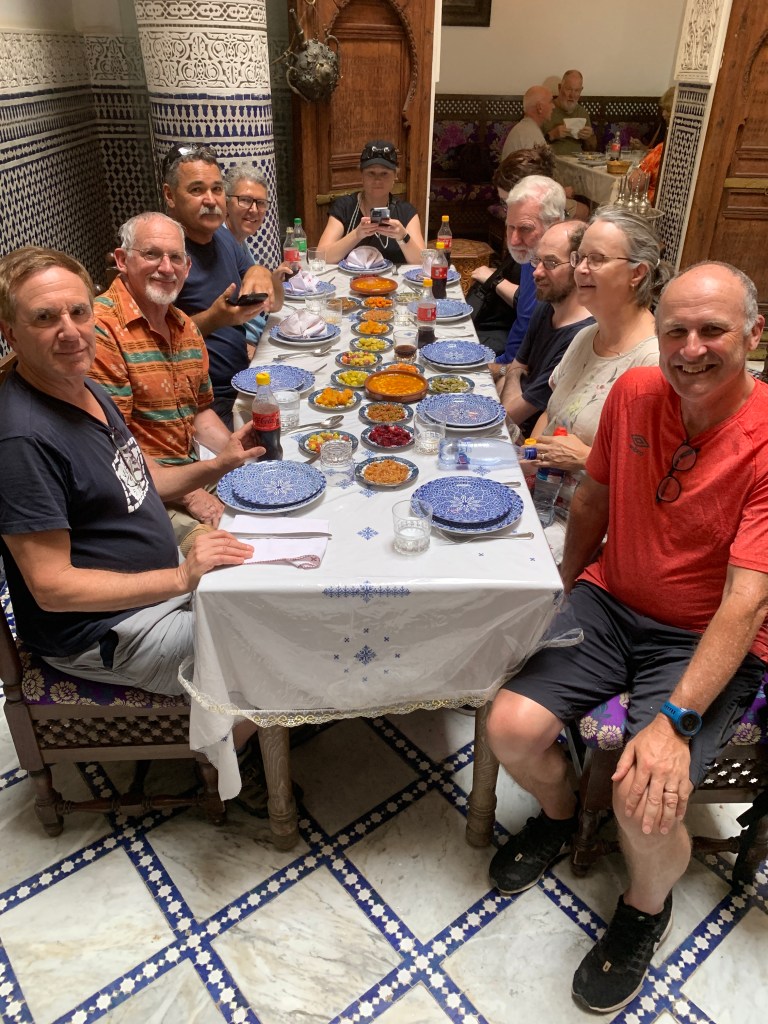 We had lunch inside, a restaurant which seem to have only tourists. Positioned in a court room were the ceiling was five floors up and decked out with Arabian decor and wall designed indigo tiles. This food house wasn’t for the locals since the price was multiple times the cost of what was being sold outside. But I didn’t mind, my Beef Tagine was excellent. Still cheaper than what I would have paid for at home. Yes, they got a tip, our group tip holder, Karen who is a finance whiz pulled out the Moroccan dollars and ensured they were happy. Everybody got a tip. Say no more. Next up the Marrakech Express.