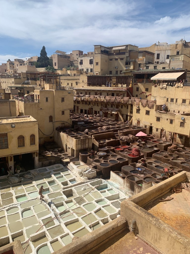 Fez otherwise known as Fes has a history dating back to the 8th century. The Medina is one of the largest in the world. Unfortunately, the world heritage site (carbon-free zone) is surrounded by muck. A jumble of dirty narrow streets, the mixture of old and new buildings. Hawkers, spruikers and vendors are out on the sidewalk waiting for the next sucker to come along. Sunglasses, trinkets, fake leather purses and Chinese-made junk were laid out for you. Beggars, Hijab ladies and the street money dogs on every corner holding their hands out. Some got my change and others got the hand.