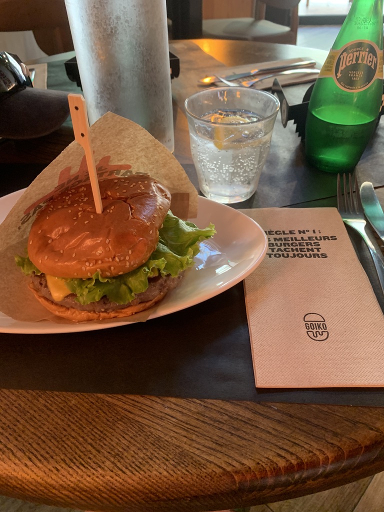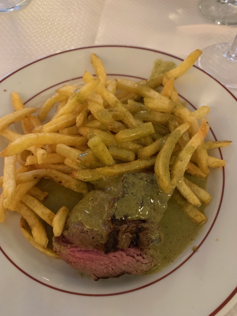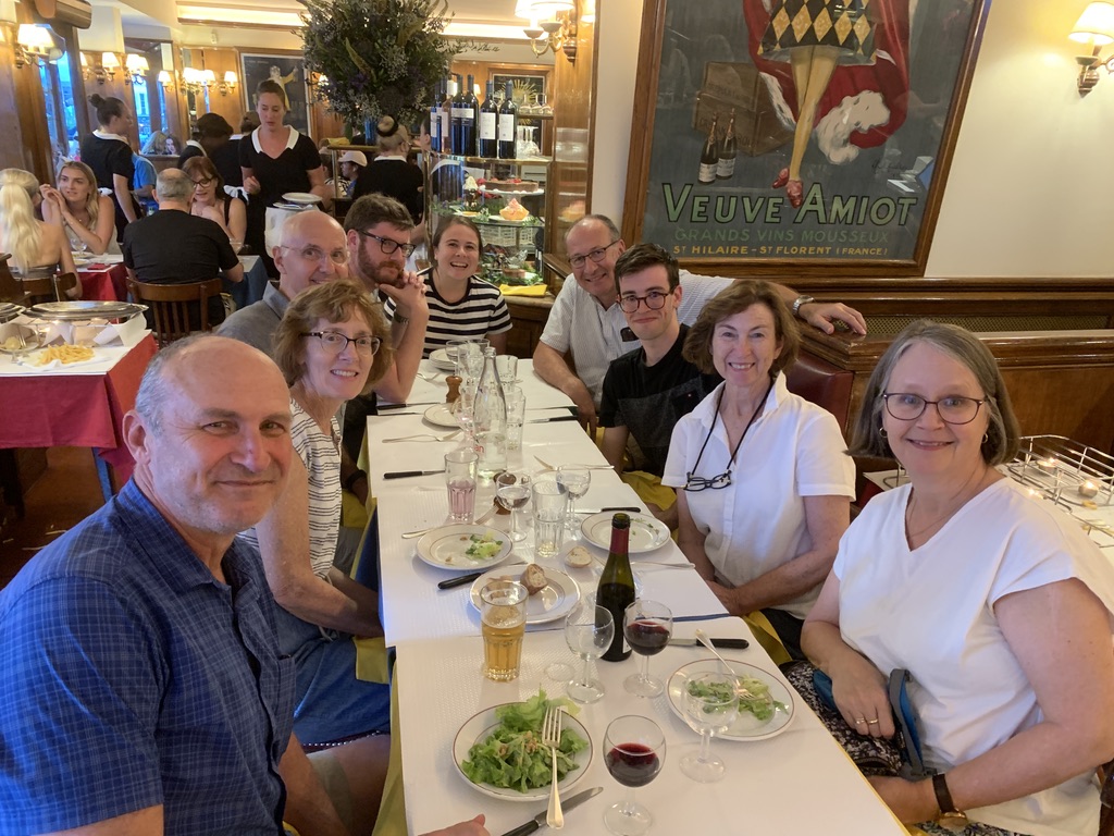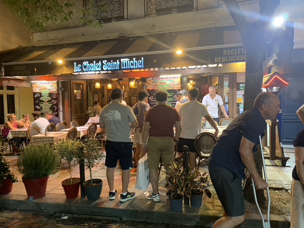 Heading to Paris from Brussels on the train. Plenty of stops and train swaps. Mmm! I’m hungry.My wife reaches into her bag and produced the goods. 2/10Arriving in Paris meeting my sister’s family of seven, we decided to walk down the Rue De La Harpe cafe district from the hotel. We got stuck into this “Which restaurant should we stop at?” I said “This one!”Yea! This is what I wanted. 10/10The next morning, we were off up the road to the nearest cafe. Do I need to show the coffee and croissant. 6/10Too many family members to coordinate for the day. The family ate at this cafe. I guess not inspired.Well, I ate at the Goiko burger place next door to the hotel. I love burgers. 9/10Another night in Paris heading down the Rue De La Harpe cafe district, this time for CrepesChez Suzette Crepes 3/10Any place that has a lineup like this, you got go there. (Le Relais de l’ Entrecote’)Interesting Walnut and Lettuce salad, not inspired 1/10One item on the menu, steak and chips with the green sauce. I suspect that the sauce had coriander in it. The variation is either rare, medium rare, medium or cooked. 4/10The wine was good. 6/10Brownie, Vanilla Glace, raspberries and an espresso. 7/10Perhaps the lineup was for the desert, strawberries on a lemon biscuit. 8/10I guess the rellies do come in handy, relaxing by the pool at my brother in-law’s brother’s (Paul) house in Jouy-en-Josas, France.Yes! A true French meal, and the baguettes were lurking on the dinner table. 8/10The exotic way of cutting cheese for the baguettes. 9/10