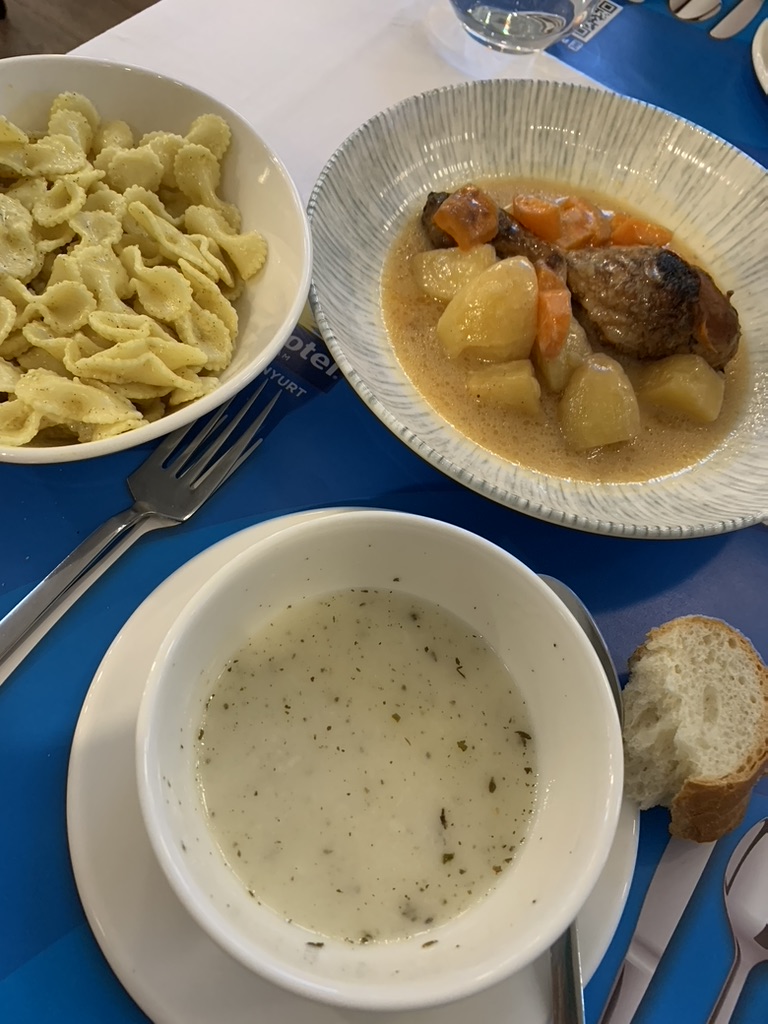 A quick stop at Istanbol, turn out to be overnight.Esenyurt, a little suburb of Istanbol providing us a sanctuary for our missed Turkish Airline flight, we were provided a complimentary breakfast and lunch in the Days Inn.Quite different to the Aussie Breakfast, 6 varieties of olives with bread and cheese. 4/10Such a simple lunch, cucumber soup, drumstick with vegies and a bowl of buttered pasta? 5/10