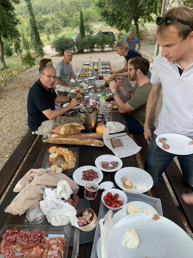 Train journey from Paris to Avignon (Provence)Relaxing at the Provence FarmhouseEach couple had to prepare a dinner (12 family members, 6 meals).Aix en Provence Markets, the pressure was on to cook the best meal.And the winner is the Seafood Paella. Simply, the best meal of the trip. 15/10Travelling around the region (Gorde), you would come across theses one bite wonders. The delicacies of the Macaroons are presented like Belgian chocolate. Specialised in the packaging.Lunch is always better when someone else cooks it.Jen went for the tomatoes and bocconcini saladPancetta and bocconcini sounded better. 7/10Les Valseuses in Apt provided a rest for lunch. Scott (Middle) appears to be focus on a thought. Perhaps, he’s departing tomorrow and doesn’t want to leave.Chicken and roast vegies. This was quite nice. 9/10Travelling for the day at the town of Chateauneuf Du Pape for a bit of wine tasting. Evatt scenting the aromas of the different wine fragrances.Celebrating our 32nd, wedding anniversary at the Benedetti CafeAs we cross the Julien bridge in the Provence region, we say goodbye and hope to visit again.