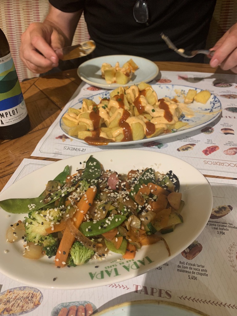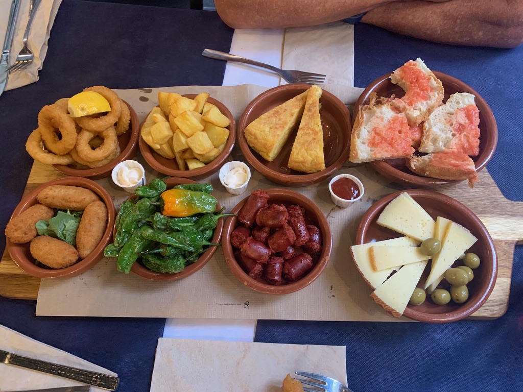 Barcelona’s La Rambla strip provides plenty of cafes. Finally sitting at the Oriente RestaurantThe simple tapas dish. Tabla de tapas (Table of Tapas) 7/10Touring the streets of Barcelona viewing the previous Olympic sectorStopping off at the seaside Marina of Port Vell, we settled at the Molo 39 Cafe. 5/10At the city hall theater, we experience Flamenco dancing. Across the street was the Tapa Tapa Bar de Tapes. Yet again when in Spain… 7/10