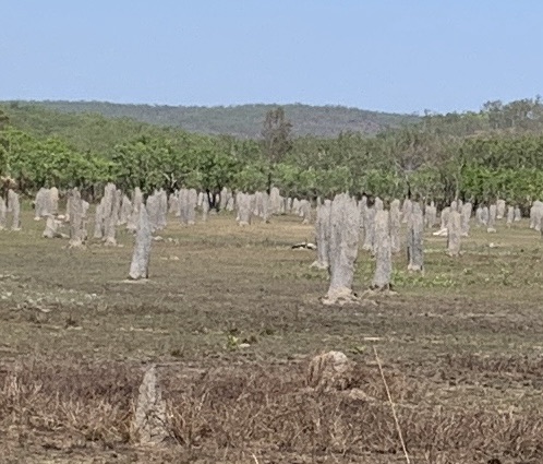 As we drive the Stuart Highway from Darwin to the Kakadu National Park, I’m intrigued by the number of Ant hills along the way. The four-hour drive presented mounds upon mounds of these tall mud cathedrals. So I wonder? What do you call a group of termite mounds? Perhaps a cluster of termite mounds, a suburb of Anthouses or a colony of anthills? There are many explanations of the ant colony, including the types of ants, starting with the queen, the drones (males), the princesses, workers, and soldiers. The groups can be called an army, a nest or a swarm. But in this case, we are talking about multiple groups—a super colony of termites. Last year, I posted about the Magnetic termite patches, where they build their nests structurally pointing North. Most of what I saw today looked like a Giant walnut sticking out of the ground—a tall mound of mud with vents.